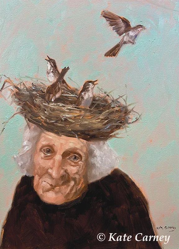 Mature faces bear stories that I would like to tell. Most of these figures are not someone specific, they are an amalgamation of expressions and features that I have seen. I give them a nest to symbolize home, and birds to help tell the story.